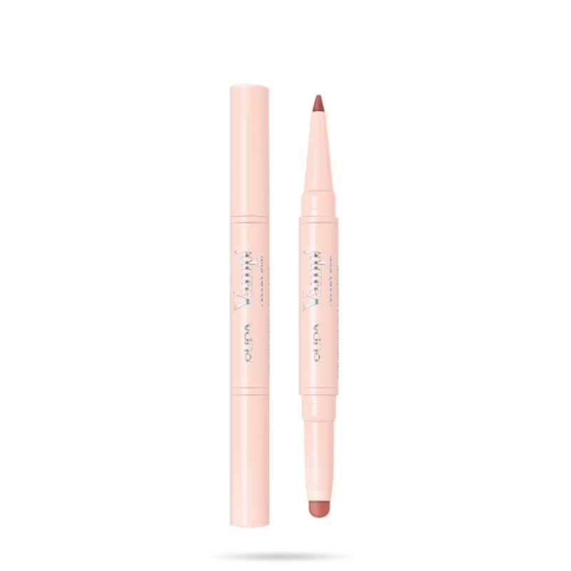 Pupa Vamp ! Duo Crémeux, un crayon pour définir et dessiner le contour des lèvres et un rouge à lèvres brillant et crémeux pour des lèvres visiblement volumineuses et repulpées.