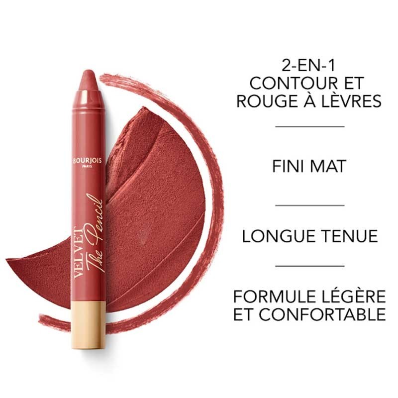 Bourjois Crayon Rouge à lèvres Velvet The Pencil, le crayon à lèvres waterproof 2en1 offrant un fini mat avec une couleur pigmentée pour des lèvres parfaitement définies tout au long de la journée.
