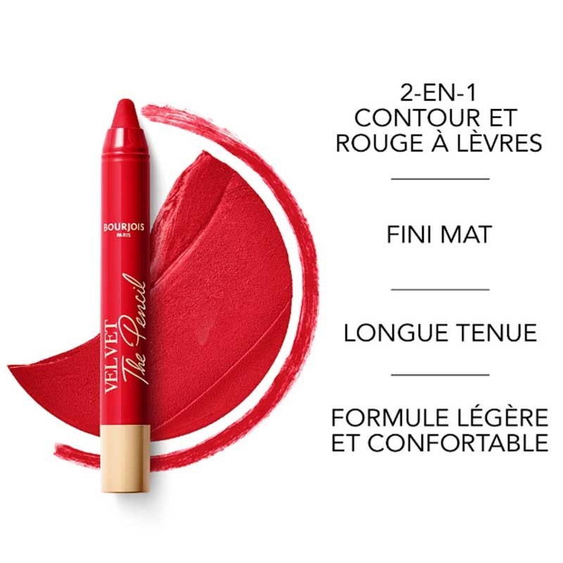 Bourjois Crayon Rouge à lèvres Velvet The Pencil, le crayon à lèvres waterproof 2en1 offrant un fini mat avec une couleur pigmentée pour des lèvres parfaitement définies tout au long de la journée.