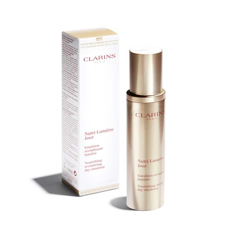 Clarins Nutri Lumière Emulsion de jour revitalisante et anti-âge, l’émulsion qui nourrit, revitalise et restaure la luminosité de la peau.
